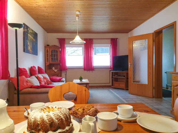 Vakantiecomplex "Ferienpark Himmelberg". Boven Thalfang, aan de rand van de plaats, 1 km van het centrum. In het complex: centrale verwarming. Centrale parkeerplaatsen. Winkel 1.3 km, supermarkt 1.3 km, restaurant 1.5 km, bar 1.4 km, bakkerij 1.3 km, café 1.3 km, bushalte "Thalfang" 900 m, openluchtzwembad 20 km, overdekt zwembad 600 m. Golfterrein (18 holes) 25 km, tennis 100 m, wandelroutes 300 m vanaf het huis, stoeltjeslift 10 km, skipisten 10 km, langlaufloipe 10 km, kinderspeelplaats 1.1 km. Attracties in de buurt: Schmuck- und Mineralienhaus Kirschweiler 22 km, Besucherbergwerk Fell 25 km, Deutsches Edelsteinmuseum 30 km, Römerstadt Trier 35 km. Bekende skigebieden kunnen gemakkelijk worden bereikt: Erbeskopf 10 km. Auto noodzakelijk. Laden en lossen van de baggage is mogelijk bij het huis.