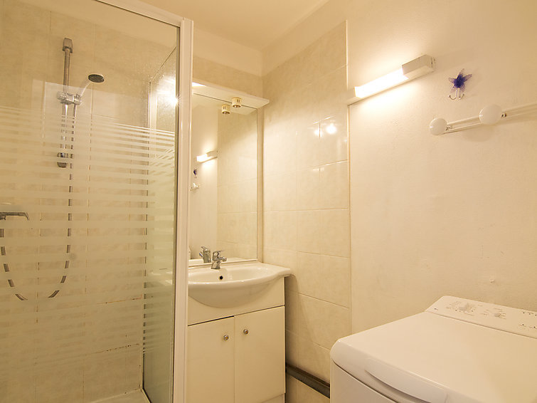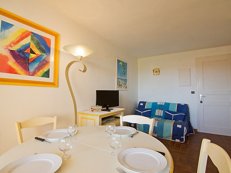 Appartement 2-kamers 40 m2 op de 1e verdieping. Eenvoudig ingericht: woonkamer met panoramavenster met TV (Flatscreen TV), DVD en ventilator. Uitgang naar het terras. Cabine, zonder kast met 1 x 2 stapelbedden (80 cm, lengte 190 cm), ventilator. 1 kamer met 1 2-pers bed (1 x 140 cm, lengte 190 cm), ventilator. Kookhoek (2 inductiekookplaten, broodrooster, waterkoker, magnetron, elektrische koffiemachine). Douche, aparte WC. Elektrische verwarming. Terras 5 m2, overdekt. Terrasmeubelen, ligstoelen (2). Beperkt uitzicht op zee. Ter beschikking: wasmachine, strijkijzer, haardroger. Internet (Internet (WiFi), extra). Parkeerplaats nr. A151/472. 1 klein huisdier/hond toegestaan. TV alleen FR. Rookmelders. In plaats van een afgesloten slaapkamer bevinden sommige slaapgedeeltes zich in een open ruimte (galerij, nis, etc.). 83107000216J5