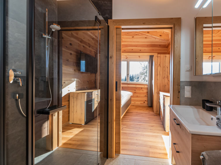 "Ferienwohnung Alpenauszeit", appartement 3-kamers 135 m2. Ruim en licht, smaakvol en gezellig ingericht: hal. 1 2-pers. kamer met douche/WC, Sat-TV, internationale TV-zenders en Flatscreen TV. Groot woonkeuken (oven, afwasmachine, 4 keramische glas kookplaten, broodrooster, waterkoker, magnetron, diepvriezer, elektrische koffiemachine) met eethoek, Sat-TV, internationale TV-zenders en Flatscreen TV. Aparte WC. Bovenverdieping: 1 2-pers. kamer met douche/WC, Sat-TV, internationale TV-zenders en Flatscreen TV. Houten vloeren, natuurstenen vloeren. Groot balkon. Balkonmeubilair. Zeer mooi panoramazicht op de bergen en het landschap. Ter beschikking: strijkijzer, kinderstoel, kinderbed tot 2 jaar, haardroger. Internet (Internet (WiFi), gratis). Rookvrij huis. Rookmelders, brandblusser. 50417-000481-2022