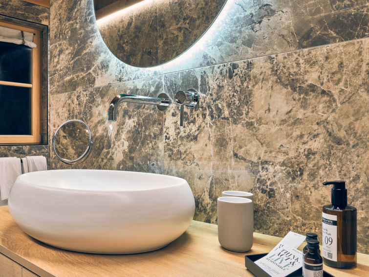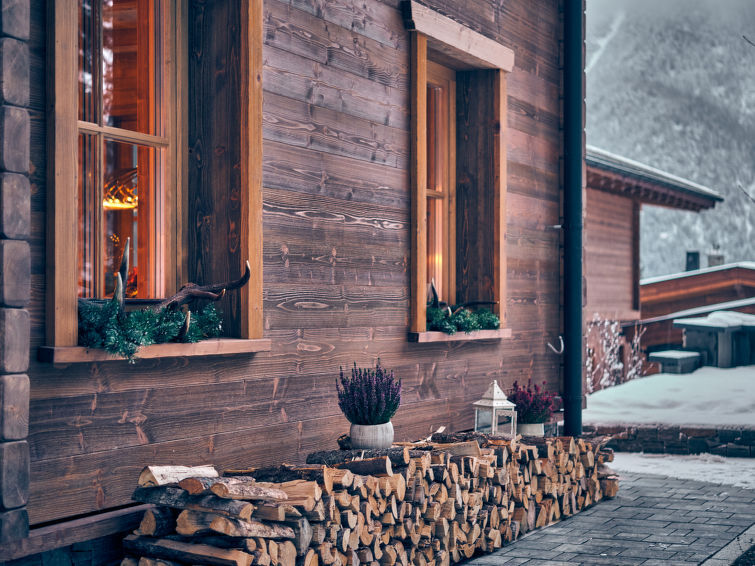 "Sissis green Chalets", chalet 16-kamers. Luxueus en met veel hout ingericht: hal. 4 2-pers. kamers, elke kamer heeft douche/WC, TV en Digitale TV (Flatscreen TV). Groot woonkeuken (afwasmachine, 4 inductiekookplaten, broodrooster, waterkoker, magnetron, elektrische koffiemachine, kookeiland) met eettafel, open haard, TV en Digitale TV (Flatscreen TV), elektrische rolluiken. Uitgang naar het terras. Bovenverdieping: 8 2-pers. kamers, elke kamer heeft bad/douche/WC, TV en Digitale TV (Flatscreen TV). Uitgang naar het balkon. 4 groot terrassen 25 m2. Terrasmeubelen, barbecue, ligstoelen. Mooi uitzicht op de bergen. Ter beschikking: wasmachine, sauna, haardroger. Internet (WiFi, gratis). Parkeerplaats. Rookvrij huis.