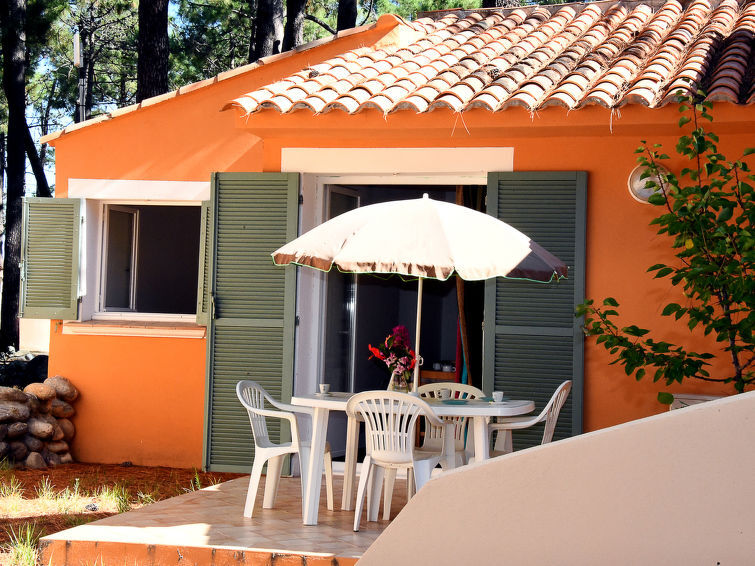 "T2 Cabine Type C", huis in een rij 2-kamers 32 tot 35 m2. Het objekt is geschikt voor 4 volwassenen + 2 kinderen. Doelmatig ingericht: woon-/eetkamer met 1 2-pers divanbed (140 cm, lengte 190 cm), 1 x 2 stapelbedden (90 cm, lengte 190 cm), TV (Flatscreen TV), air-conditioning. Uitgang naar het terras. 1 kamer met 1 2-pers bed (140 cm, lengte 190 cm). Kookhoek (afwasmachine, 2 keramische glas kookplaten, waterkoker, magnetron, elektrische koffiemachine). Bad/WC. Elektrische verwarming. Balkon of terras. Terrasmeubelen. Uitzicht op de tuin. Ter beschikking: Internet (WiFi). Maximaal 2 huisdieren/honden toegestaan. Rookmelders.