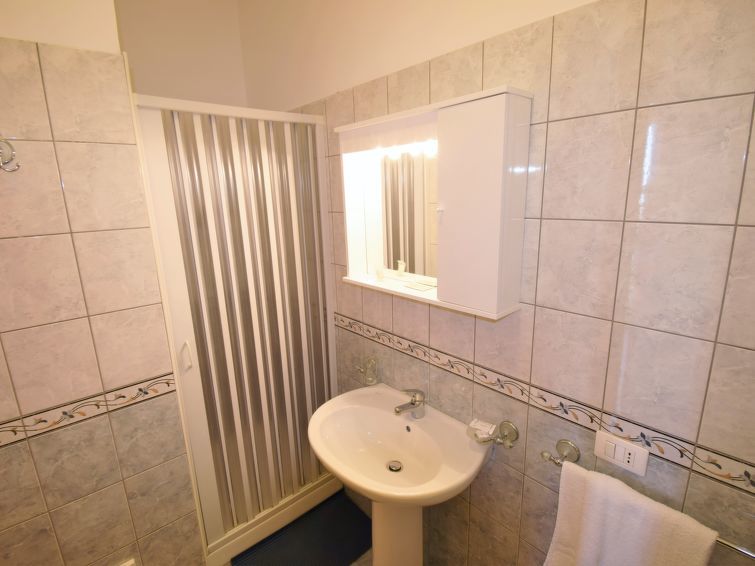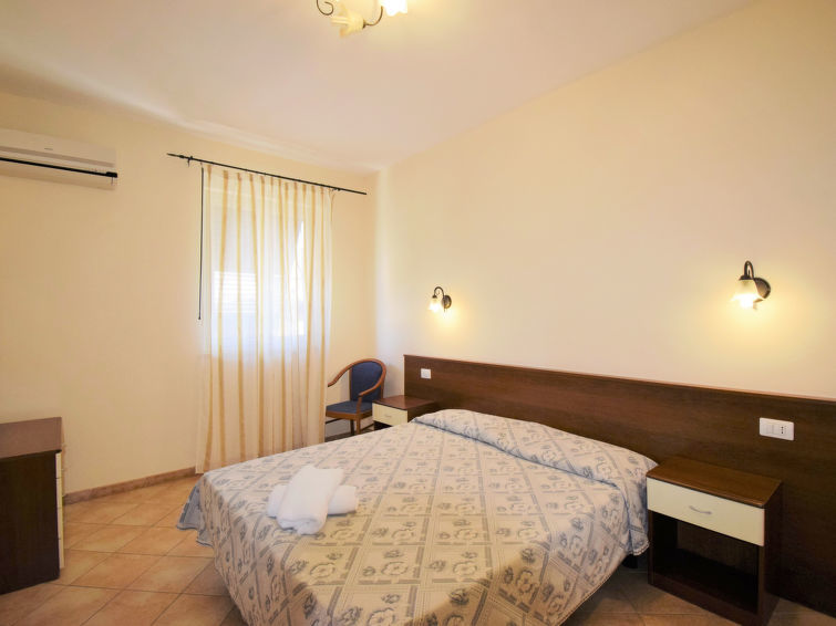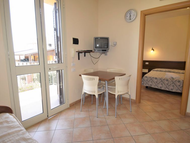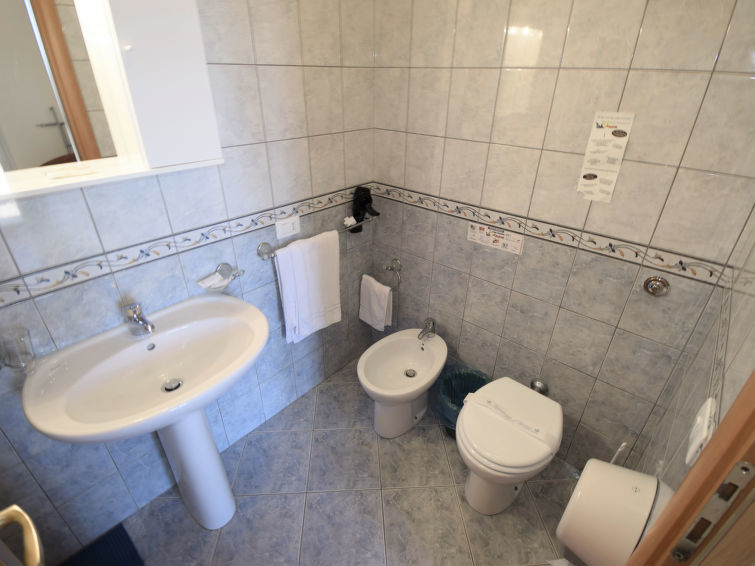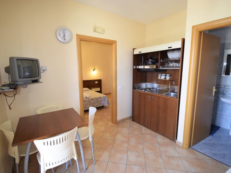 Appartement 2-kamers 30 m2 op de 1e verdieping. Eenvoudig en doelmatig ingericht: woon-/eetkamer met 1 x 2 stapelbedden, TV (Flatscreen TV). Uitgang naar het balkon. 1 2-pers. kamer met air-conditioning. Kleine kookhoek (2-pits kookplaat). Douche/bidet/WC. Verwarming, heteluchtverwarming. Verwarming alleen beschikbaar van 01.12. tot 31.03. Klein balkon 3 m2. Balkonmeubilair. Ter beschikking: haardroger. Internet (Internet (WiFi), gratis). Parkeerplaats (1 Auto). Koelkast zonder vriesvak. Rookmelders, brandblusser. IT084028B45ZYBHTGH